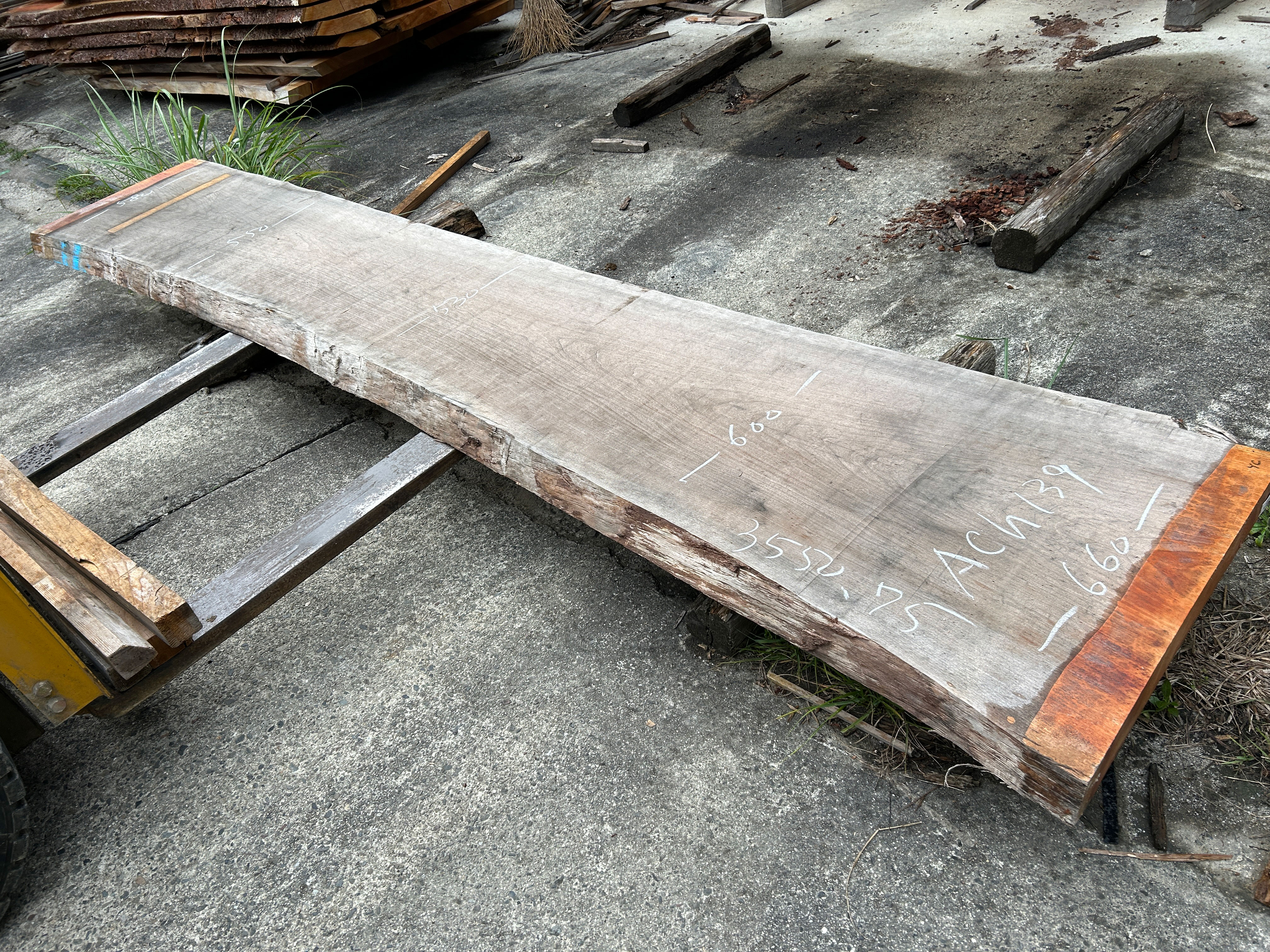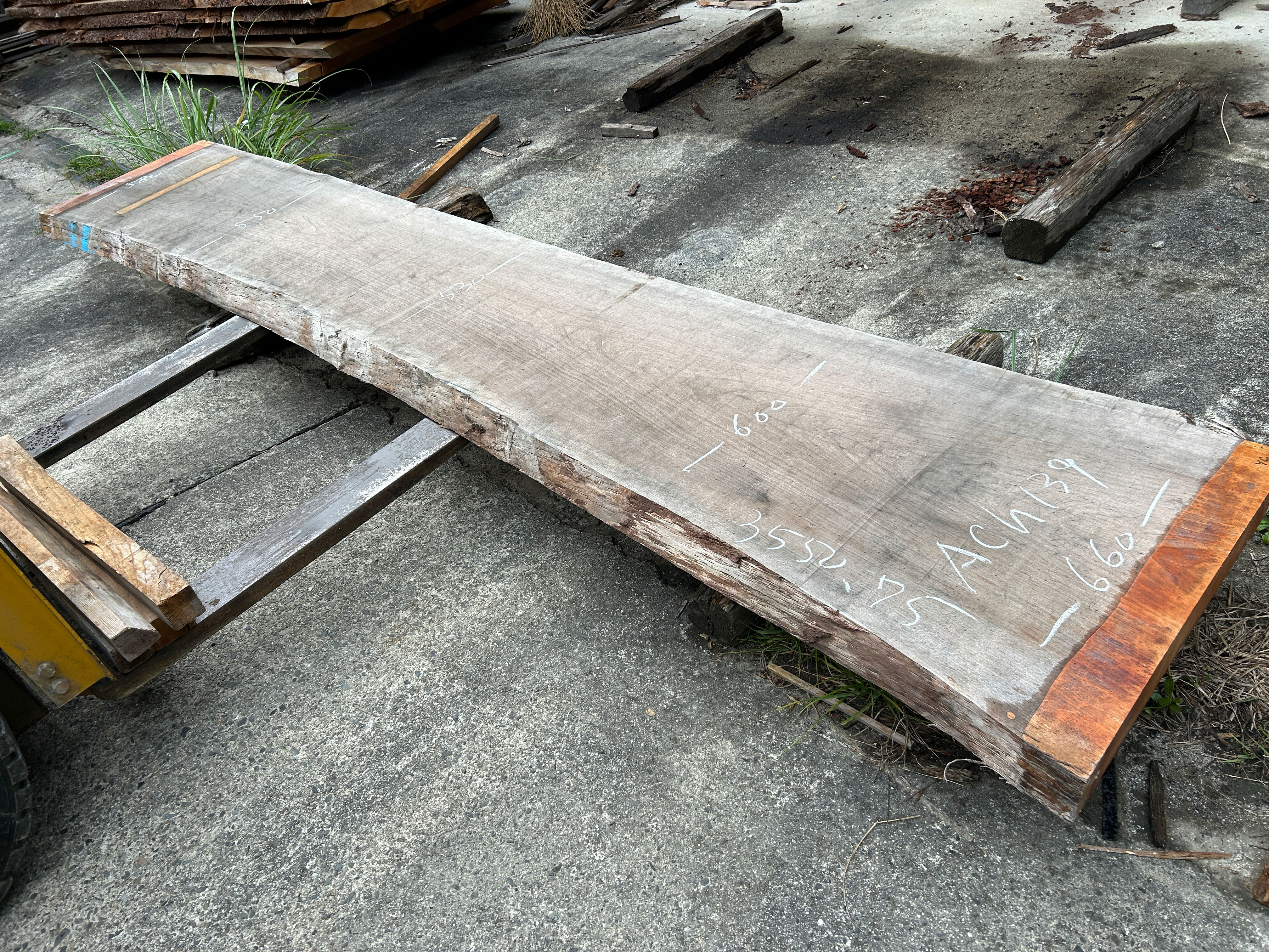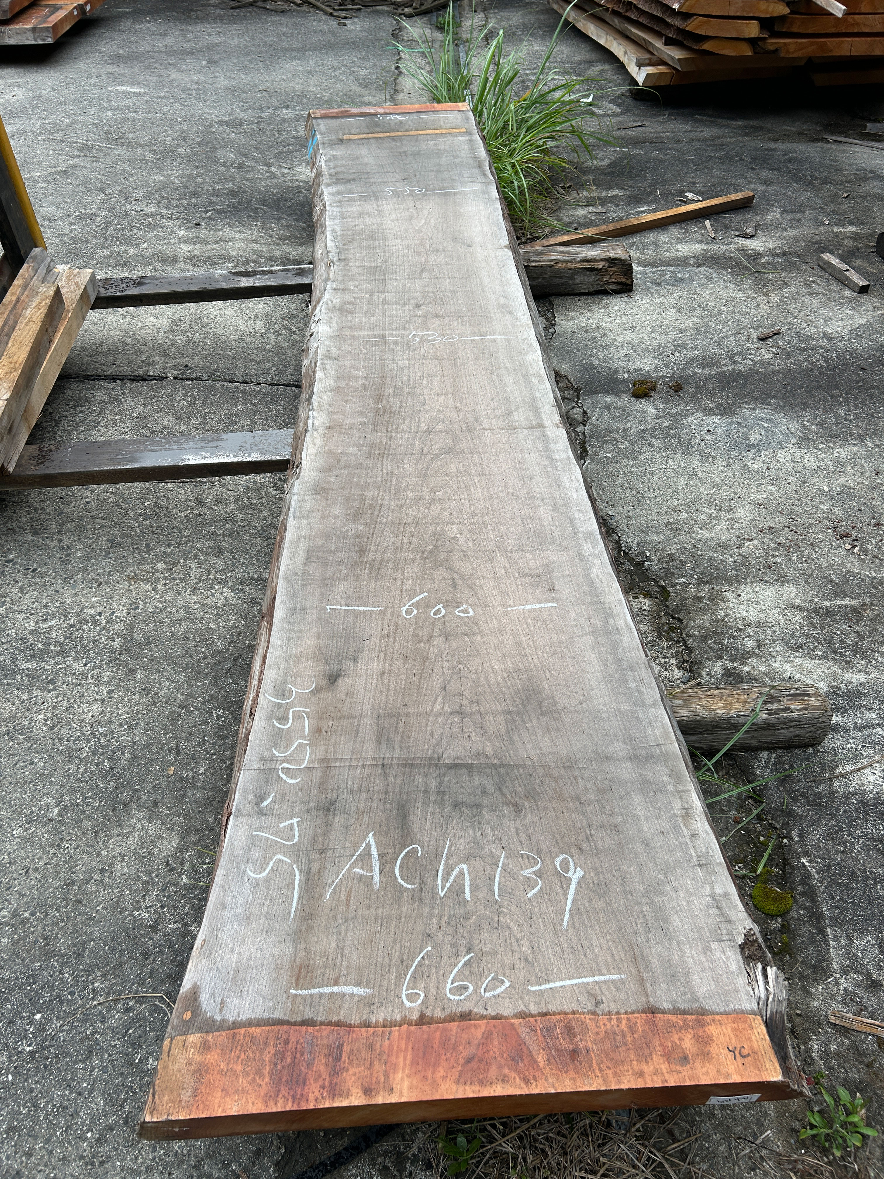 【取引状態】NEW! 【名 称】アメリカンブラックチェリー一枚板ACH139 【樹 種】アメリカンブラックチェリー(外国産) 【サイズ】L3550*W580~530~660*t75 【仕上げ】仕上げ加工なし 【価 格】¥220,000(税別) 【説 明】アメリカンブラックチェリーのカウンター用一枚板です。節のない綺麗な板です。くすんだ色になっていますが削ると鮮やかな色合いです。 乾燥材 加工費別途