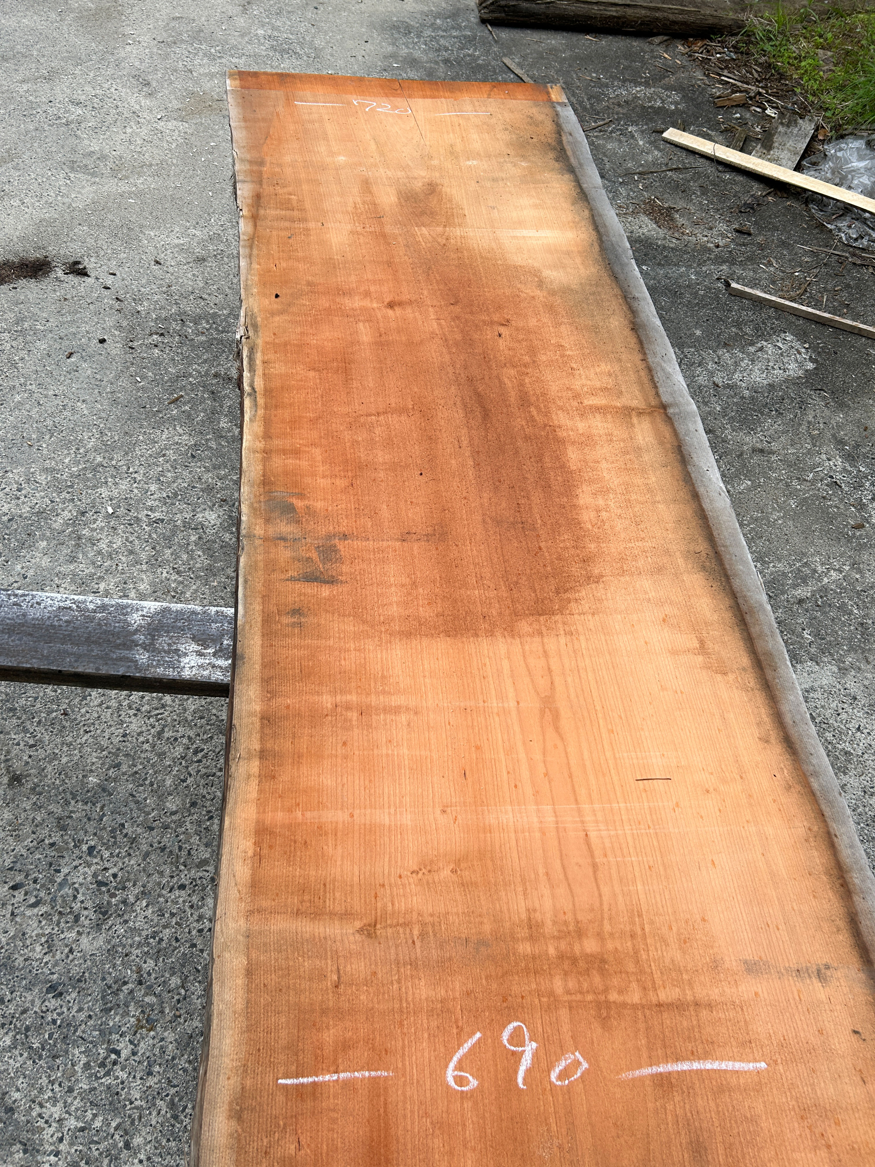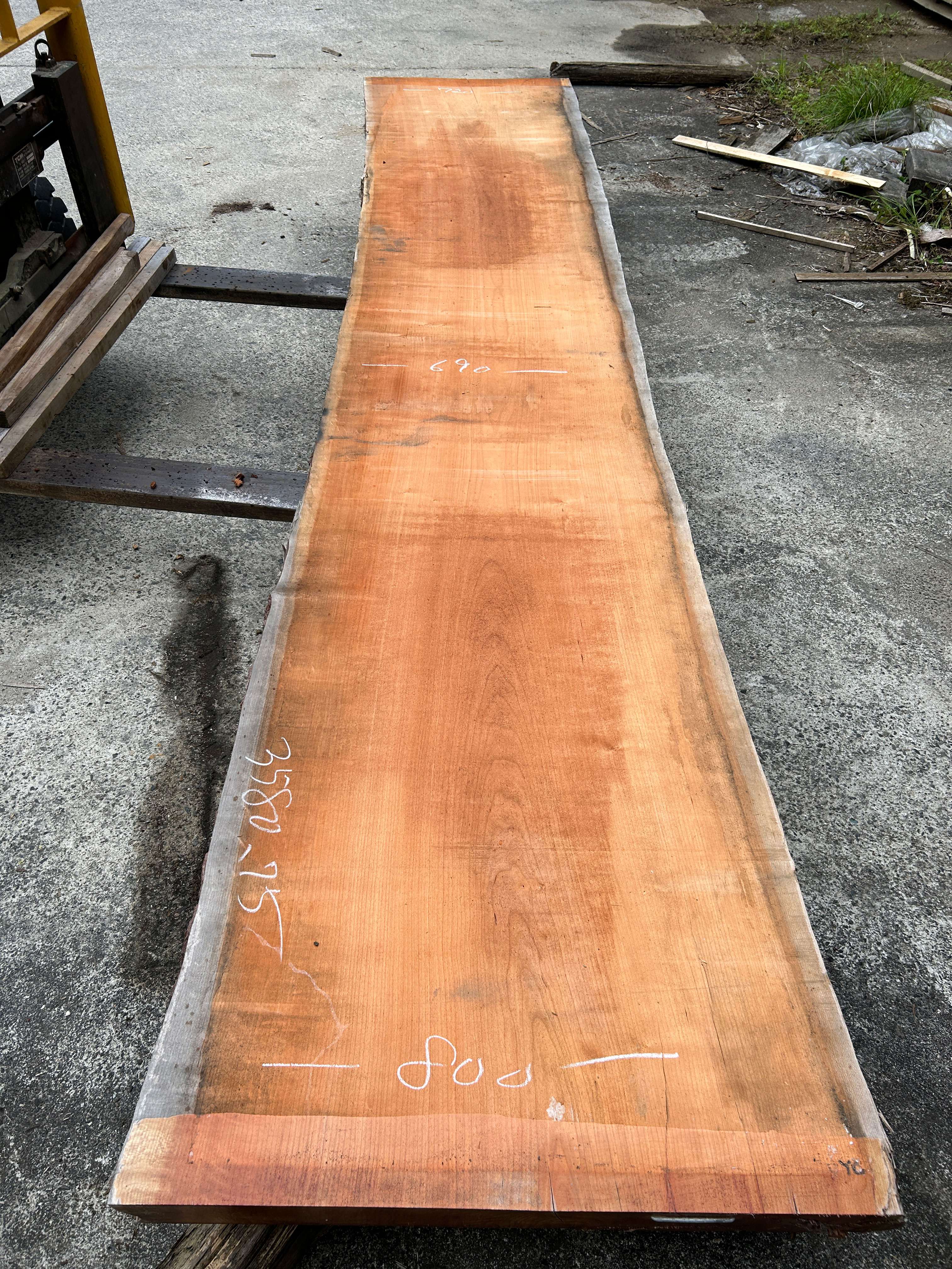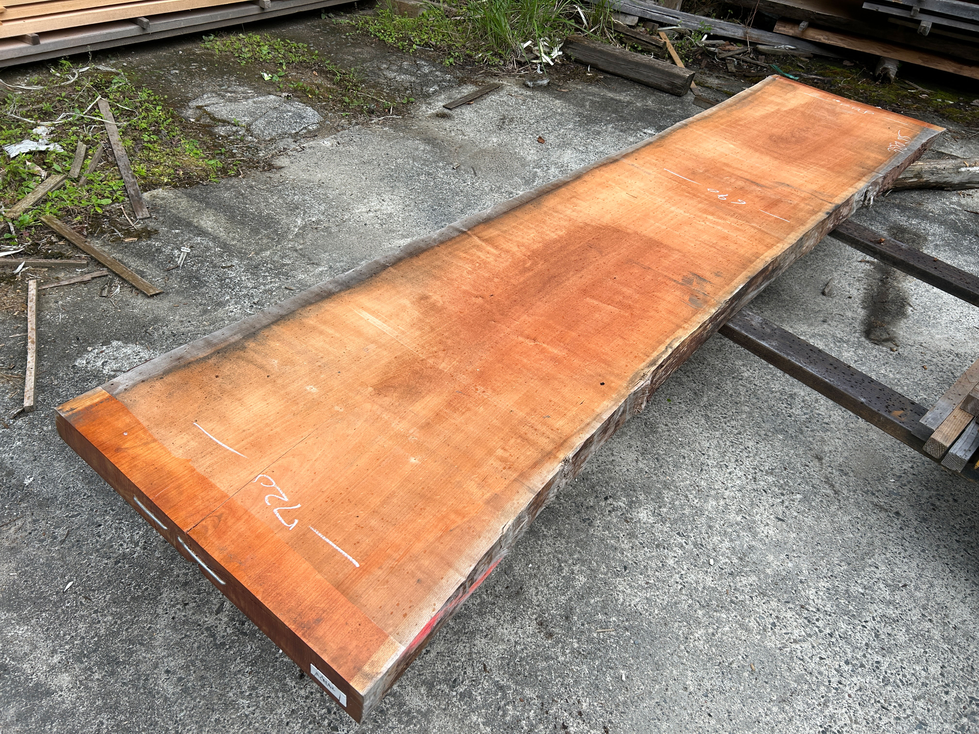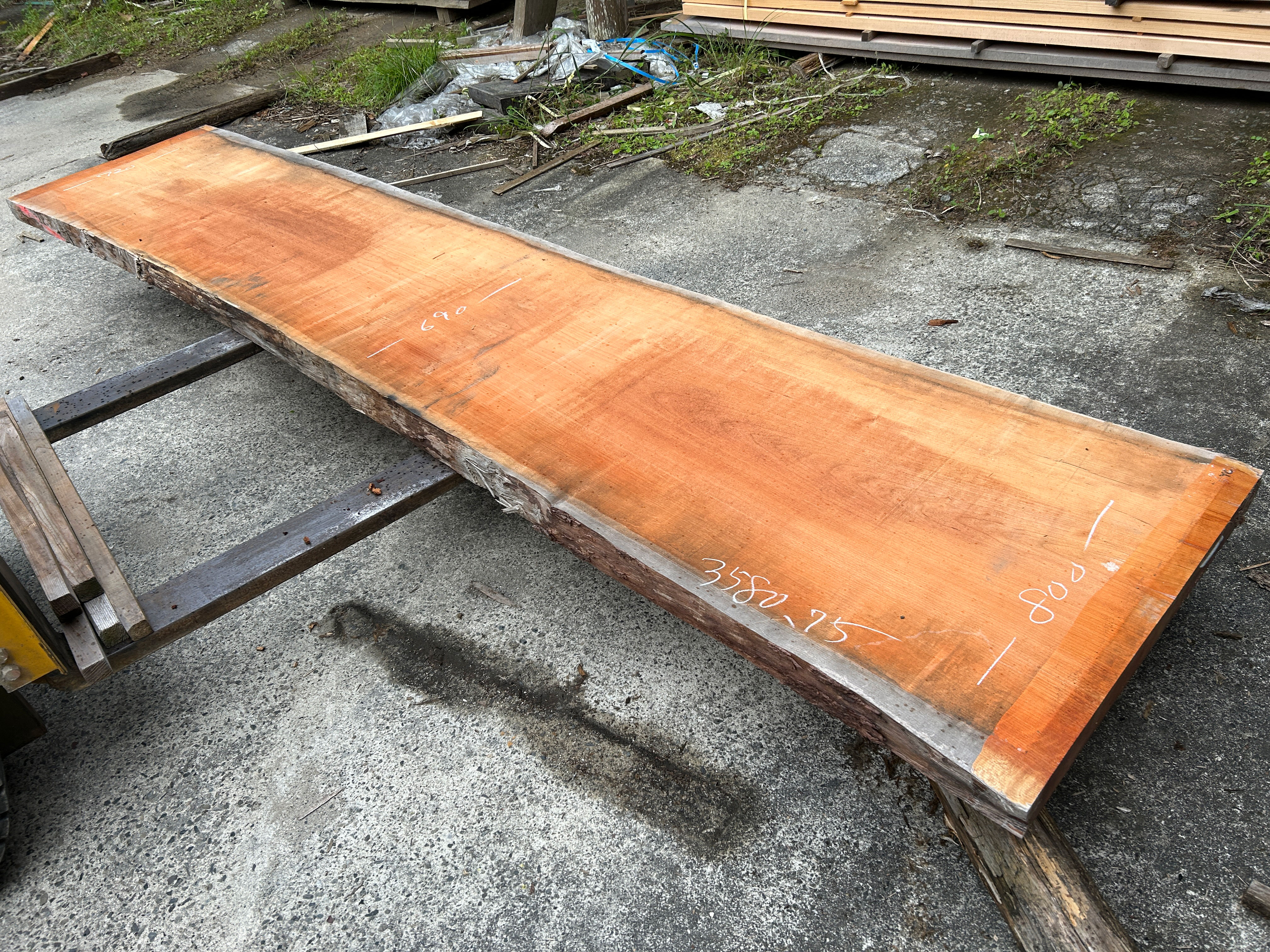 【取引状態】NEW! 【名 称】アメリカンブラックチェリー一枚板ACH142 【樹 種】アメリカンブラックチェリー(外国産) 【サイズ】L3580*W720~690~800*t75 【仕上げ】仕上げ加工なし 【価 格】¥278,000(税別) 【説 明】店舗や住宅用カウンターに最適なアメリカンブラックチェリーの一枚板です。幅700弱の貴重な一枚板です。小口割れあり。 乾燥材、加工費別途