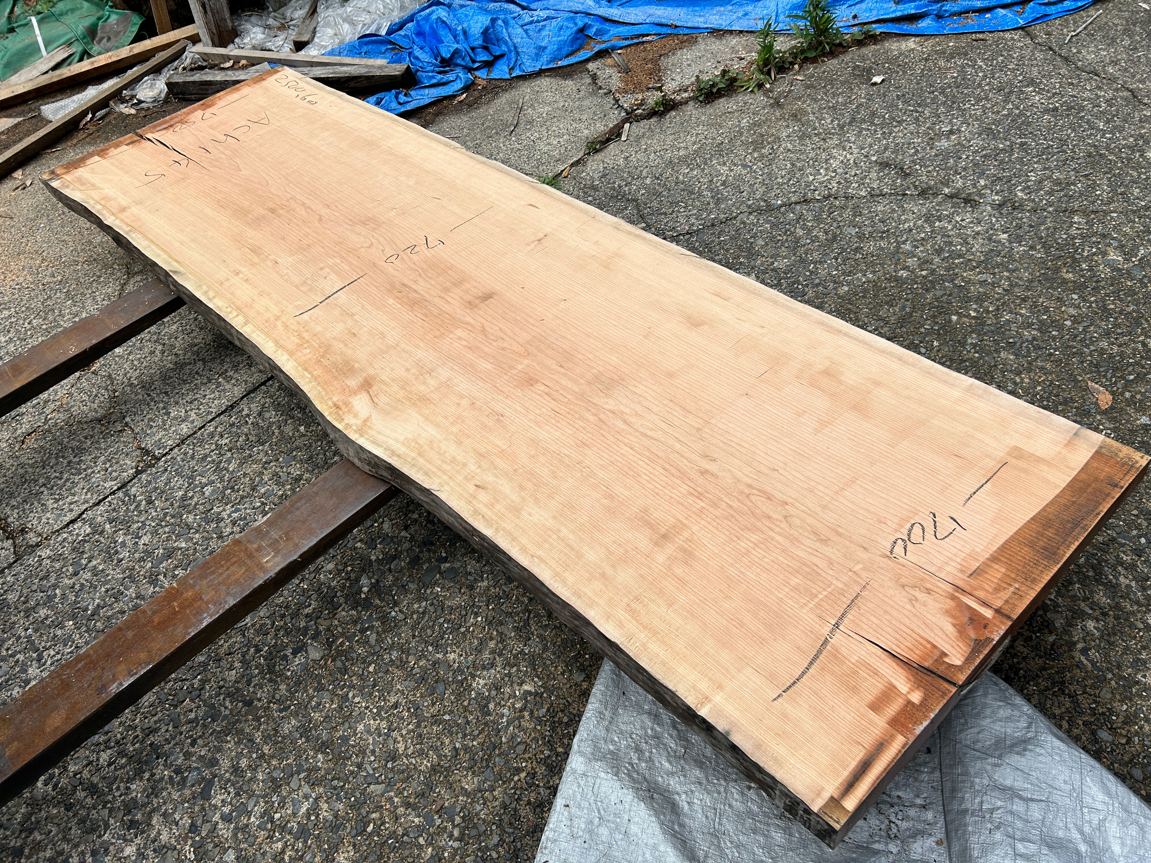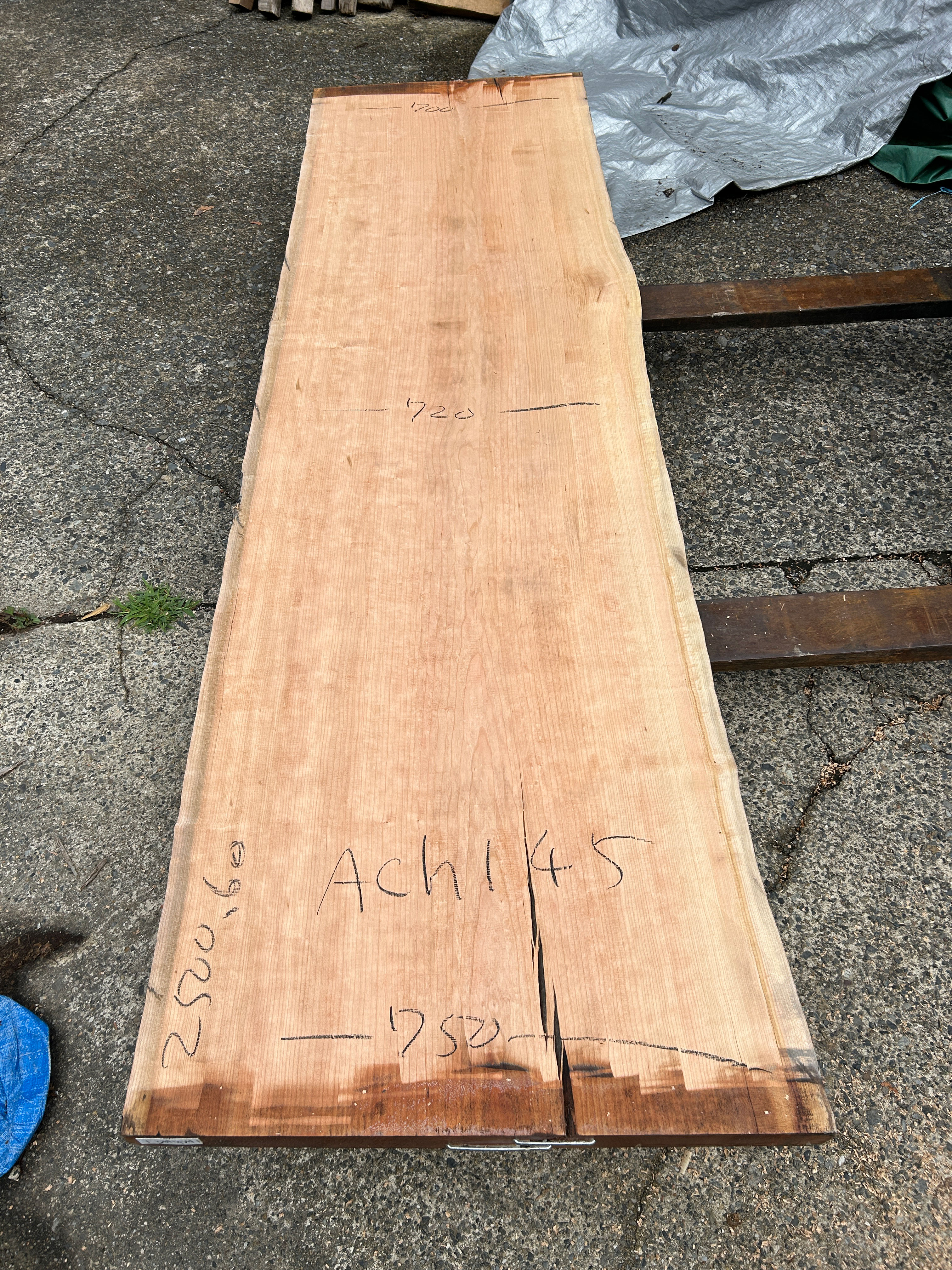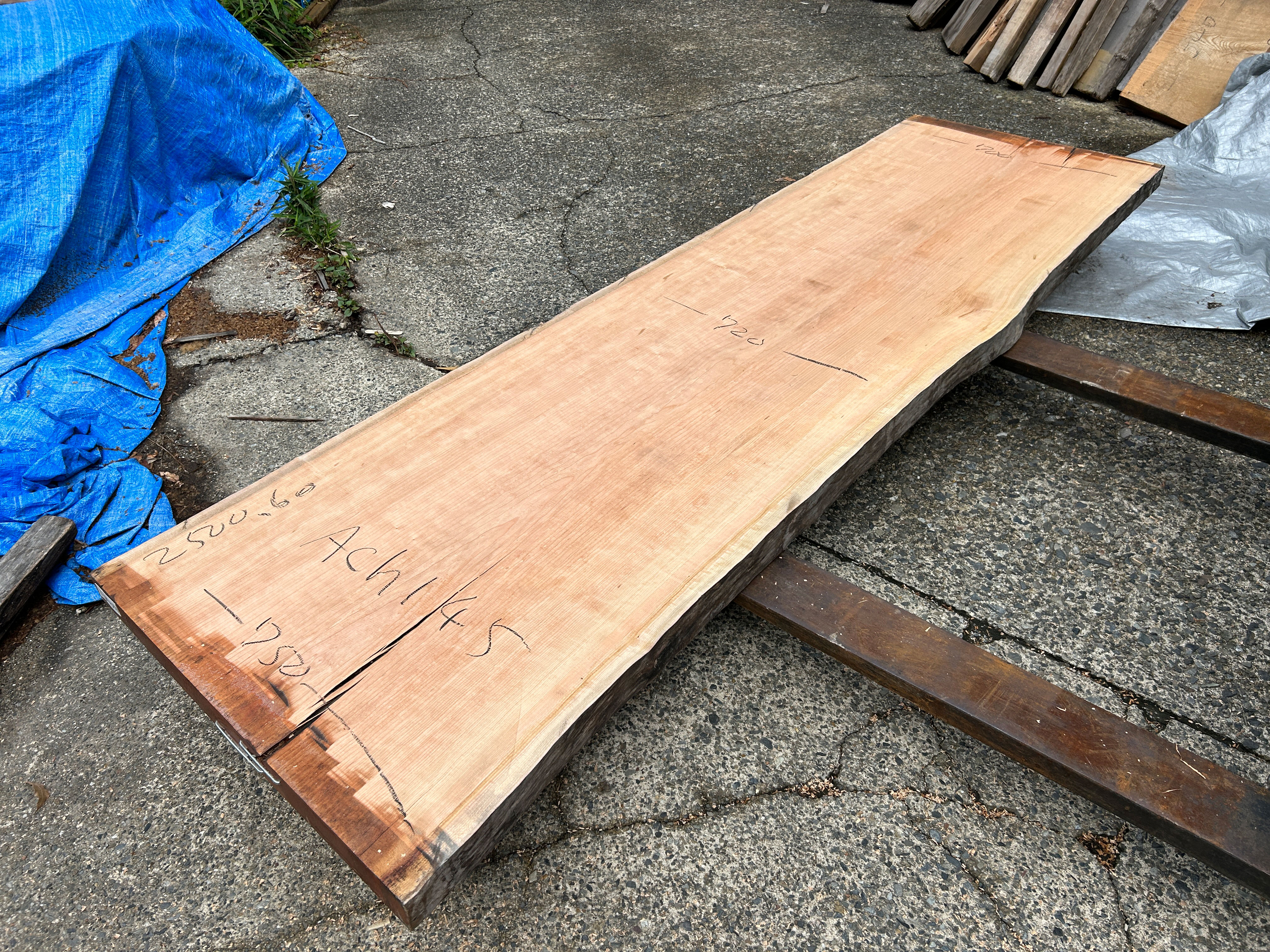 【取引状態】NEW! 【名 称】アメリカンブラックチェリーACH145 【樹 種】アメリカンブラックチェリー(外国産) 【サイズ】L2500*W700~720~750*t60 【仕上げ】仕上げ加工なし 【価 格】¥130,000(税別) 【説 明】2.5m幅700サイズのアメリカンブラックチェリーの一枚板、スリムなサイズのテーブルやカウンターにいかがでしょうか? 乾燥材、加工費別途、2mサイズに加工する場合別途¥73,000