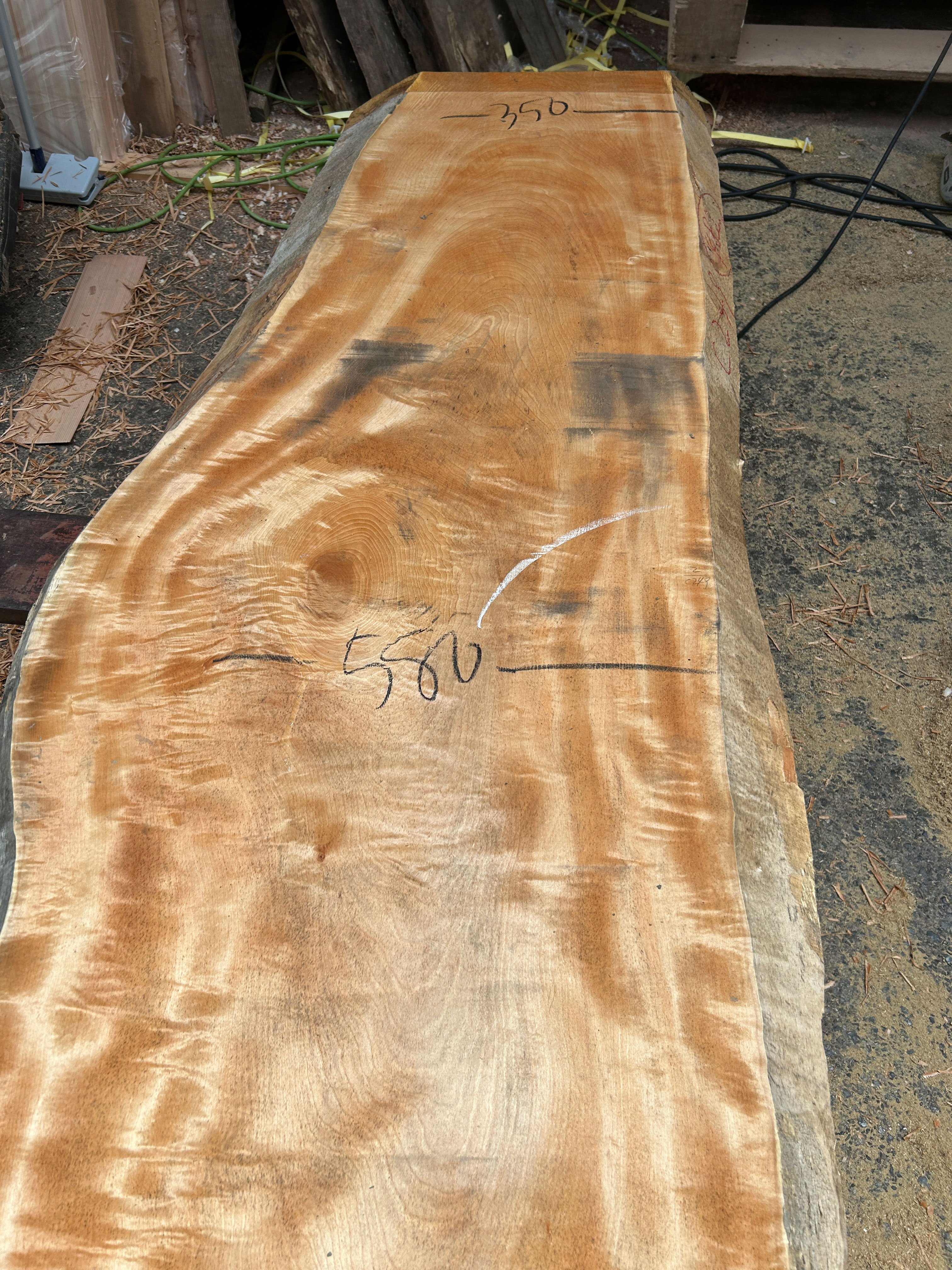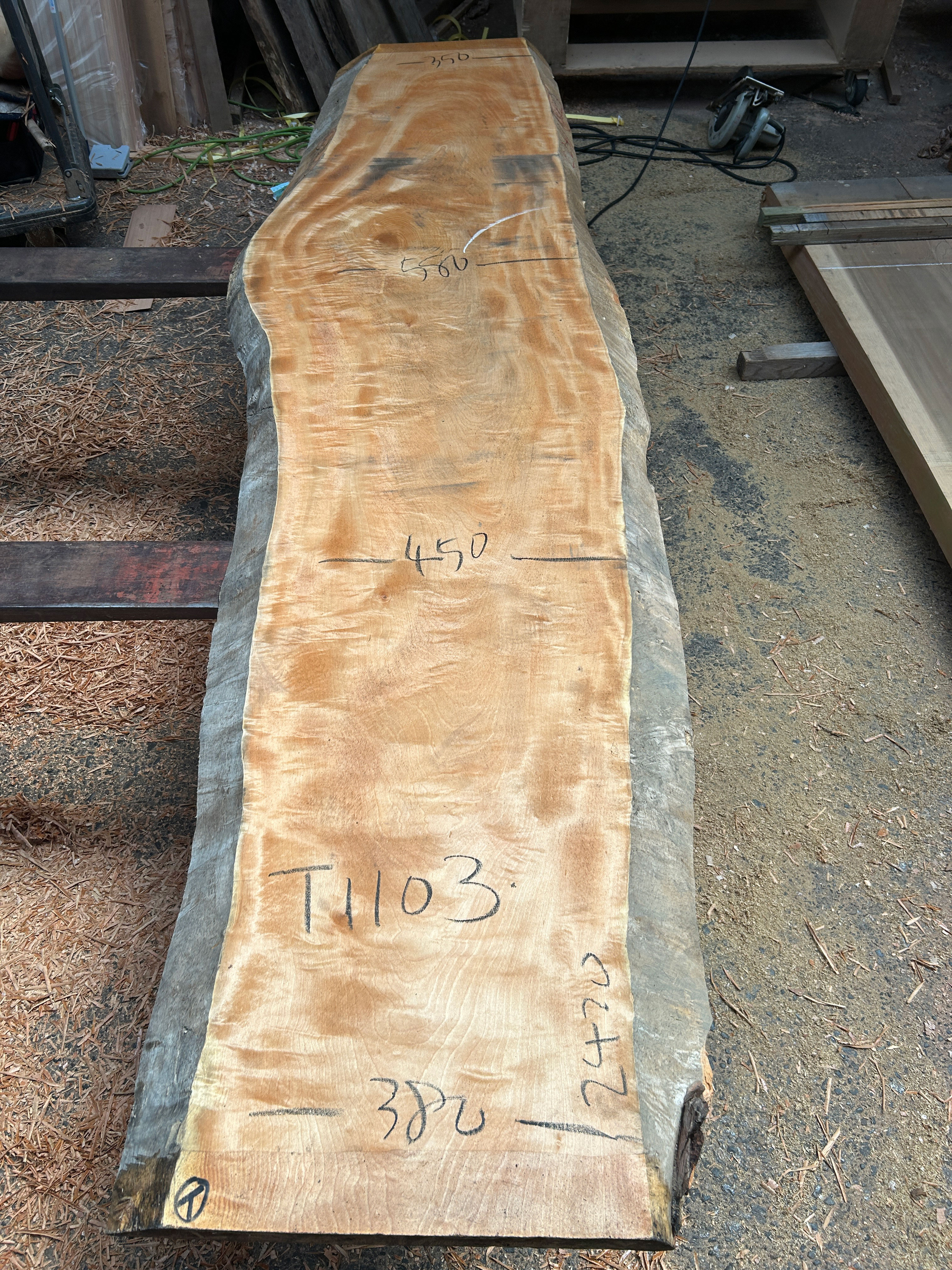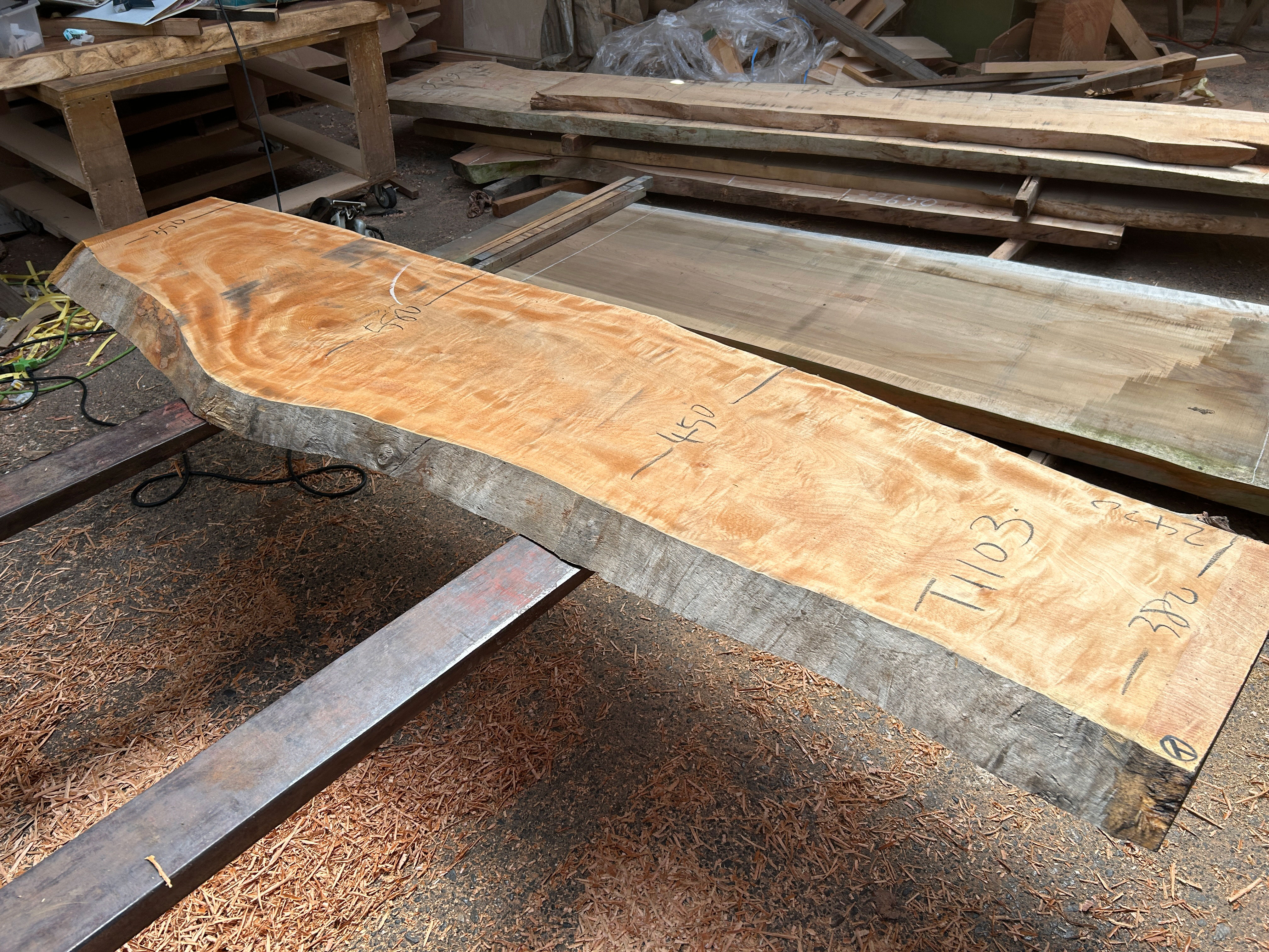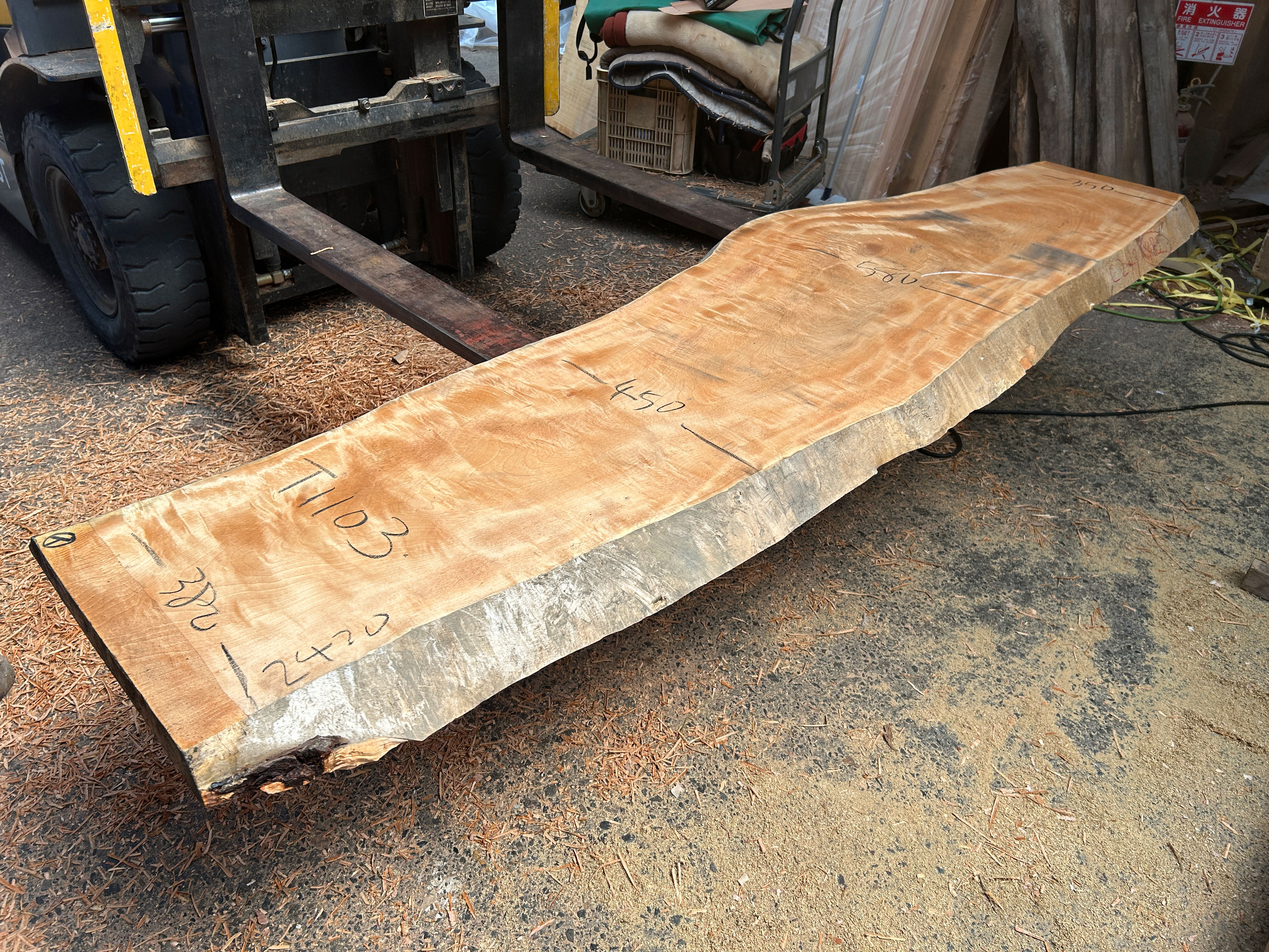 【取引状態】NEW! 【名 称】栃の木一枚板t1103 【樹 種】栃(国産) 【サイズ】L2400*W350~450~380*t60 【仕上げ】仕上げ加工なし 【価 格】¥86,000(税別) 【説 明】杢のある栃の一枚板、カウンターや小さめのリビングテーブル等にどうぞ。乾燥材